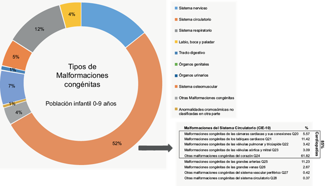 Las malformaciones congénitas (MC) figuran entre las principales causas de muerte en la población infantil de la CAA, particularmente en la primera infancia (0-4 años). De las distintas MC, las que provocan el mayor número de muertes son las cardiopatías congénitas (CC) las cuales se producen cuando el corazón o los vasos sanguíneos cercanos al corazón no se desarrollan con normalidad (Ngwezi et al. 2018). Estas anomalías son las más comunes en todo el mundo y causan más de 40 % de las muertes prenatales (Boyd et al. 2022). En México, cada año nacen entre 12 mil y 16 mil bebés con alguna malformación cardiaca y es el principal padecimiento congénito registrado en el país (SSA 2022).