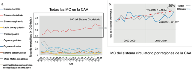 Las MC del sistema circulatorio, además de ser las anomalías que generan el mayor impacto en la mortalidad infantil, muestran una tendencia creciente significativa en 2000-2019, tal como se observa en la figura 5a, según la prueba de Mann-Kendall (p = 0.0000325). Esta tendencia a nivel de la cuenca es producto del aumento en la tasa de mortalidad por estas MC en la región poblana (Fig. 5b). De manera que, la situación con respecto a las MC del sistema circulatorio en la población infantil es aparentemente más grave en esta parte del territorio, en donde se registró un incremento significativo del 20 % en la tasa de mortalidad en la última década (p = 0.0000159). Asimismo, se identificaron diferencias entre los niños y las niñas de la cuenca en el período 2003-2019, siendo las tasas de mortalidad en niños superiores (p = 0.00000376).