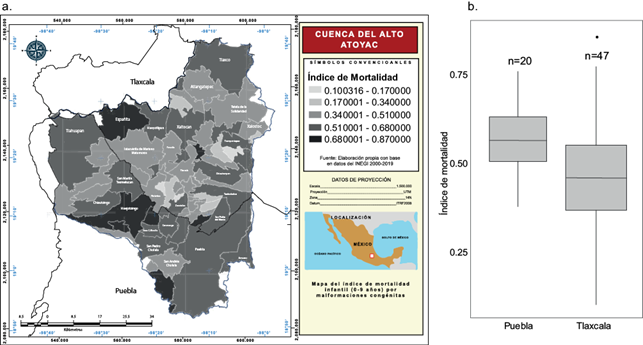 En la figura 6a se indica en escala de grises, el rango del índice de mortalidad infantil por MC en cada municipio. Se aprecia que un mayor número de municipios poblanos presentan índices de mortalidad dentro de los rangos más elevados (0.51-0.87), detectándose diferencias estadísticamente significativas entre regiones (Puebla y Tlaxcala) según la prueba de Mann-Whitney-Wilcoxon (p = 0.0037), con valores más altos de mortalidad en la región poblana (Fig. 6b).