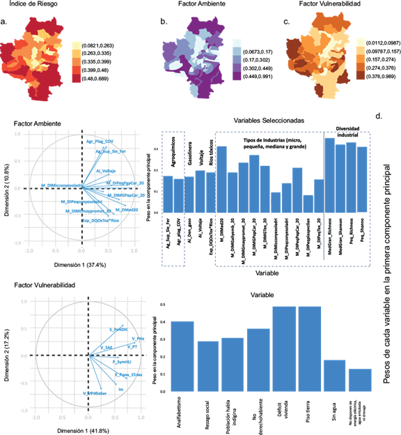 Fig. 7 Mapas de índices de riesgo a), de los factores ambientales b) y de vulnerabilidad c). En la parte inferior d), izquierda: pesos de las variables en las primeras dos componentes principales. Derecha: orden de importancia de las variables en las primeras componentes principales correspondientes a los factores ambiental y de vulnerabilidad que componen el índice de riesgo de mortalidad.