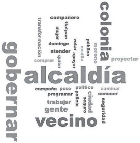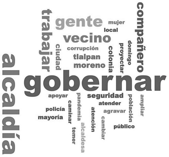 En términos generales, el discurso no fue específico, pues la candidata insistía en un “programa integral” y se centraba en los servicios urbanos y la seguridad, vinculándolos sólo en ocasiones con cuestiones de género. Esta aproximación propició una limitada interacción con el electorado en torno a problemas particulares; se adoptó más bien una estructura de intercambio fundamentada en transacciones políticas de carácter difuso, con discursos que planteaban acuerdos generales y presuponían cierta confluencia de intereses entre la candidata y la ciudadanía. En la nube de palabras de 2021 fue recurrente el compromiso de “trabajar intensamente”, con el lema “Alcaldesa 24/7”, mientras que a los asistentes se les mencionaba siempre como “vecinos”.6