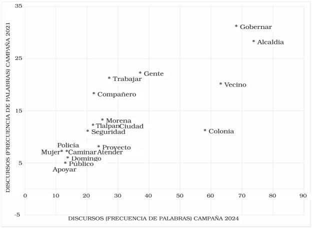 En el estudio de las campañas 2021 (Tejera Gaona 2022) y 2024 en la alcaldía Tlalpan se analizó el contenido discursivo de la misma candidata a alcaldesa por Morena mediante un análisis comparativo del contenido del discurso, y se profundizó en los cambios en las estructuras semánticas y en los patrones discursivos empleados en ambos contextos, utilizando nubes de palabras que sintetizan de manera visual cómo ciertos términos, ideas o temas cobraron mayor importancia para sustentar una agenda política con base en ciertas propuestas y valores. En 2021 la candidata perdió con un 38.9 por ciento de los votos frente al 41.5 por ciento de su contrincante; y, en 2024 triunfó con un 52.7 por ciento frente al 38.9 por ciento de su adversaria.