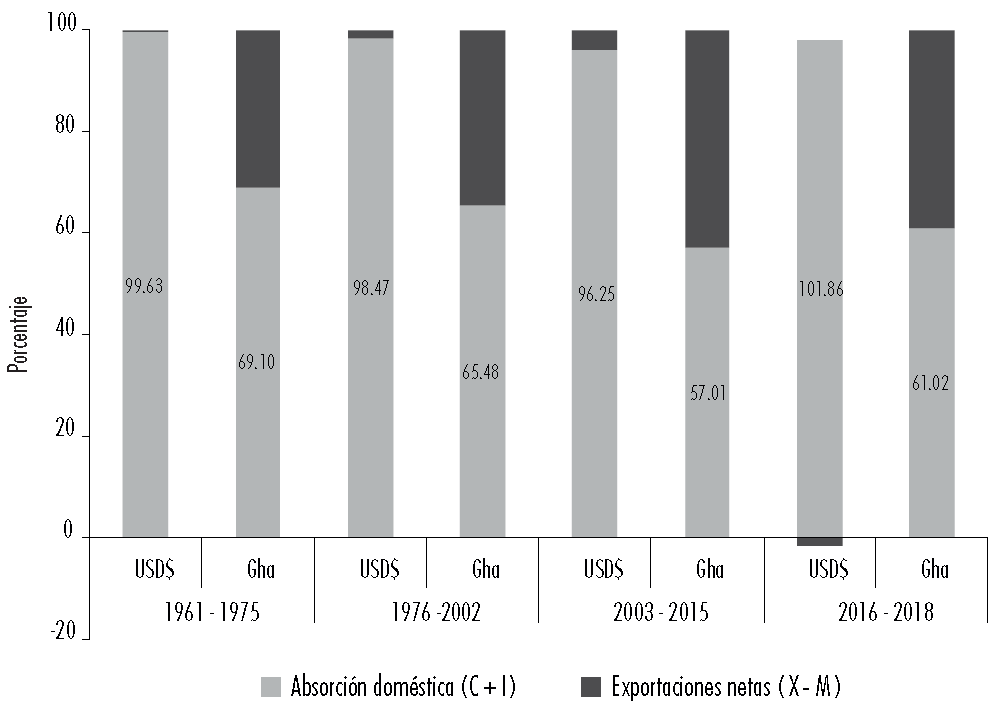 Figura 2 Patrón de producción. Absorción doméstica y exportaciones. En Gha. Argentina (1961-2018)