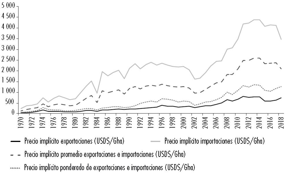 Si se comparan, según distintas etapas económicas durante 1976-2002, el precio implícito de las importaciones fue 790% superior al precio implícito de las hectáreas globales exportadas. En cambio, durante 2003-2018 el cociente fue de 557%, donde si bien hubo un aumento del precio implícito de tanto las importaciones como de las exportaciones, el precio de las últimas creció en mayor medida.