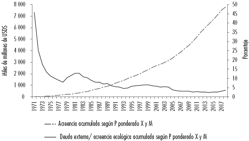 Figura 6 Acreencia ecológica acumulada según precio implícito ponderado de las exportaciones e importaciones y relación deuda externa/acreencia ecológica