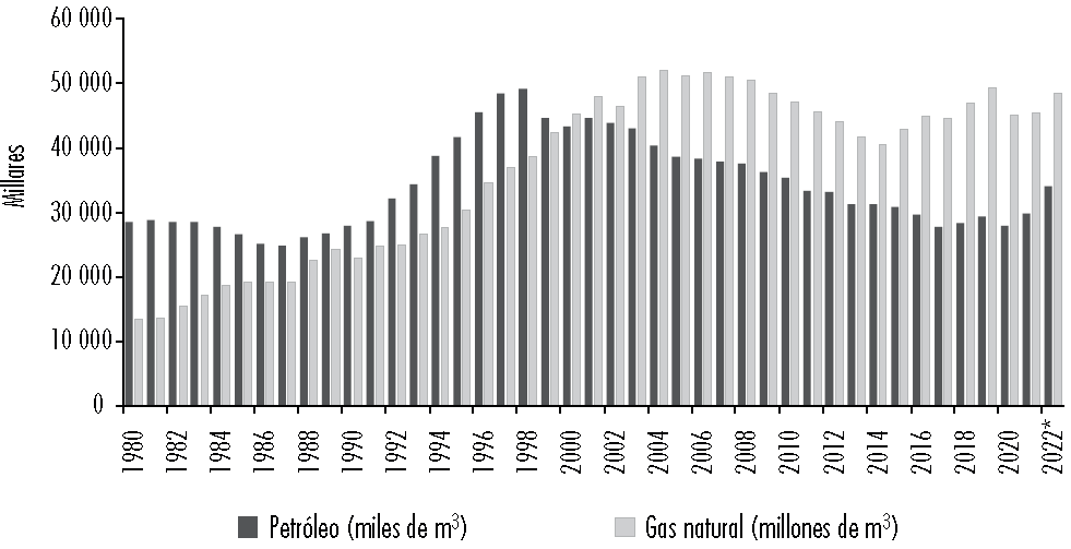 Figura 1 Producción de petróleo (millones de m3) y gas (miles de millones de m3) (1980-2022)