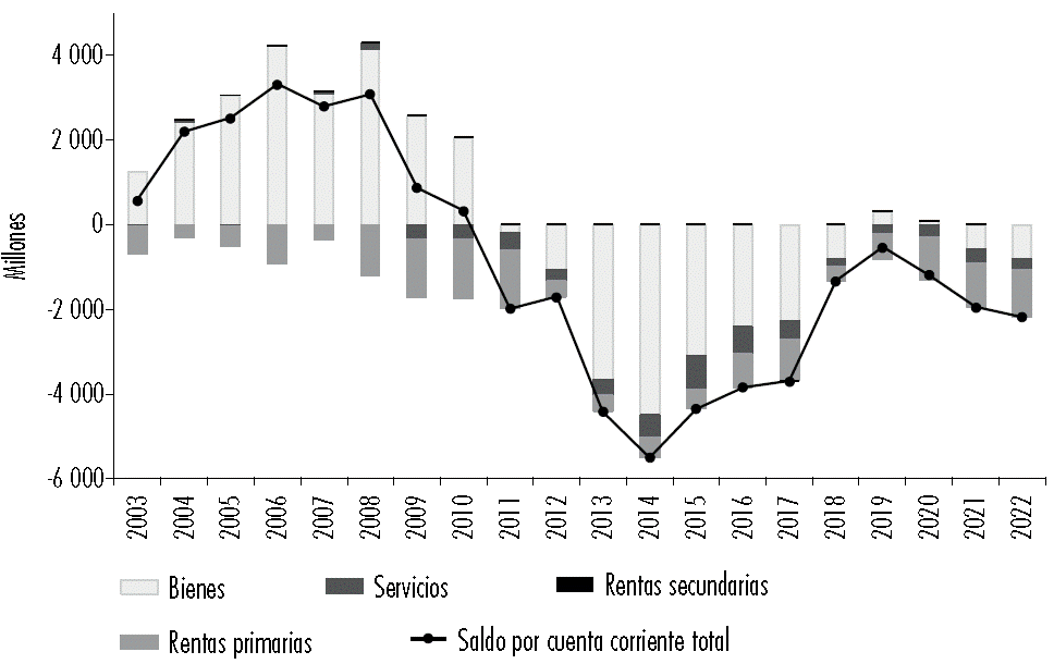 Figura 10 Saldo por cuenta corriente asociado al petróleo y gas crudos, millones de USD$ (2003-2022)