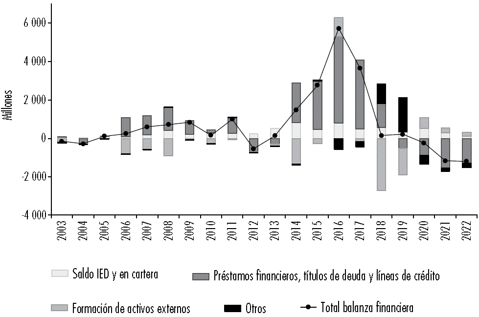 Figura 11 Saldo balanza financiera asociado al petróleo y gas crudos, millones de USD$ (2003-2022)