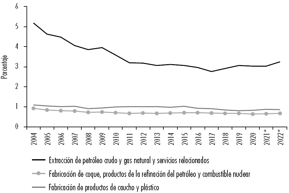 La participación del sector hidrocarburífero argentino en el PIB, incluyendo la petroquímica básica, ha estado dominada por las actividades extractivas que, no obstante, han sufrido una paulatina caída desde principios de siglo hasta situarse en torno del 3.3% (véase Figura 2). Se está, por tanto, ante un sector con participación declinante en la economía que representa alrededor del 5% del PIB, cuando al principio del periodo analizado suponía más del 7%.
