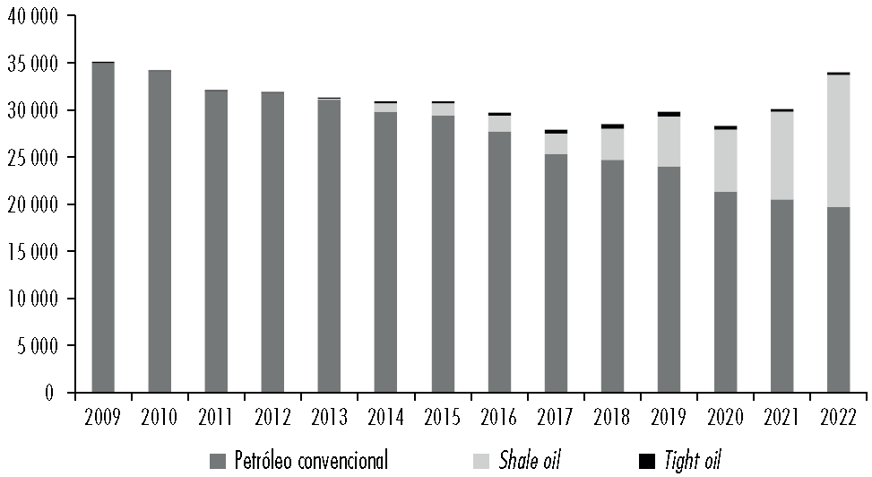 Figura 3 Producción de petróleo, por tipo, millones de m3 (2009-2022)