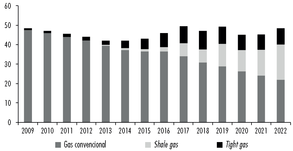 Figura 4 Producción de gas, por tipo, miles de millones de m3 (2009-2022)