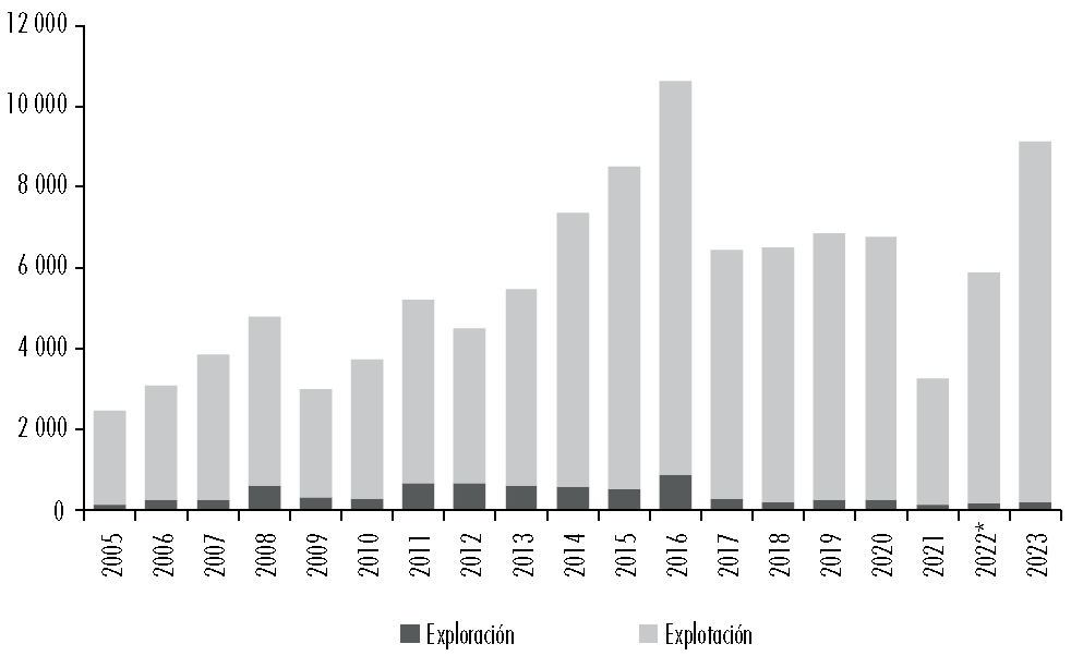 Notas: los valores de exploración en el año 2005 son anómalos: suman USD$327 292 millones, de los cuales USD$324 974 millones corresponden a la empresa Petrominera Chubut S.E. -que no vuelve a aparecer en años posteriores. Por tanto, se ha eliminado del año 2005 la inversión en explotación correspondiente a dicha empresa; *el dato de 2022 es provisional.