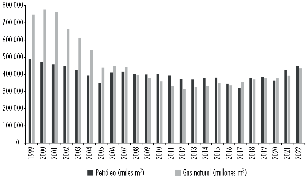 Figura 6 Reservas probadas de petróleo (miles de m3) y gas (millones de m3) (1999-2022)