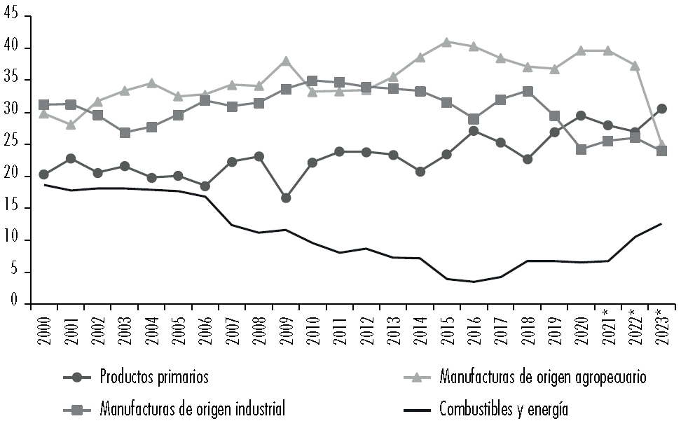 Figura 7 Participación en las exportaciones totales de Argentina, en % (2003-2022)