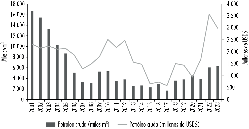 Figura 8 Exportaciones de petróleo crudo, en miles de m3 y miles de millones de USD$ (2001-2022)