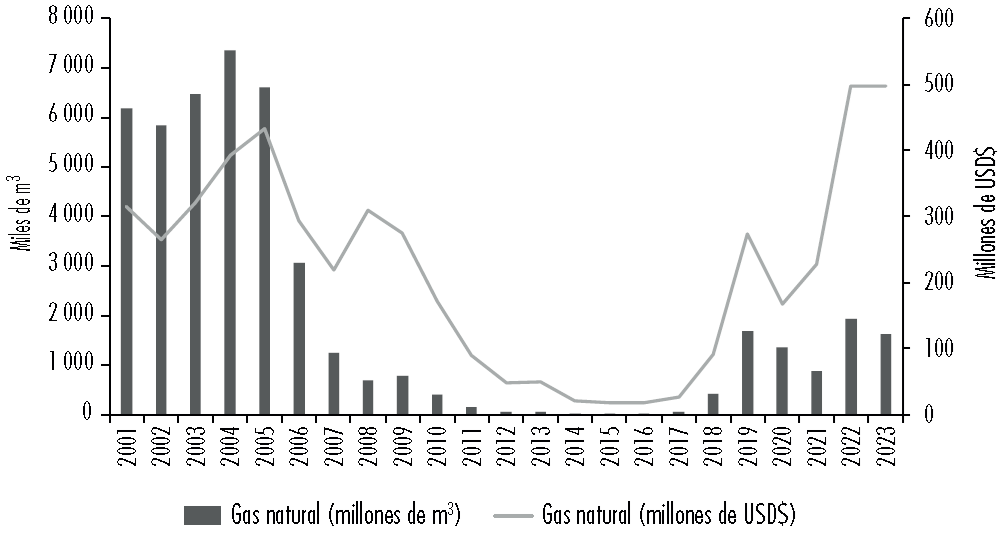 Figura 9 Exportaciones de gas, en millones de m3 y millones de USD$ (2001-2022)