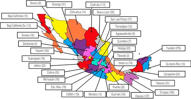 Participaron 1,538 trabajadores de la salud, cuyas respuestas se agruparon para su análisis en generales y por entidad federativa: 66% correspondieron a los estados de Yucatán, Chiapas, Nayarit, Oaxaca, Ciudad de México y Coahuila, y el otro 44% se distribuyó en los 26 estados restantes (Figura 1).