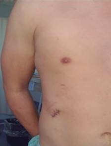 Se recibe con vía aérea permeable saturando a 99%, Glasgow 15 puntos, tensión arterial 154/96 mmHg, presión arterial media 101 mmHg, frecuencia cardiaca 92 x’, temperatura 36.5 oC, índice de choque 0.68. Con herida toracoabdominal derecha sin hemorragia activa de 4 cm como se observa en la Figura 1, con dolor 7/10 en la escala visual análoga, dolor a la palpación profunda en hipocondrio derecho, así como herida de 6 cm en extremidad superior izquierda a nivel de tercio medio del cúbito, así como 4 cm del tercio medio del radio, sin hemorragia activa, pulso radial y cubital presente.