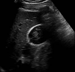 Figura 6: Imagen de ultrasonido en la que se observa vesícula biliar sin contenido hemático, de paredes delgadas, sin solución de la continuidad ni líquido libre perivesicular.