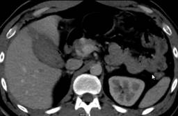 El primer estudio disponible en nuestra unidad para descartar trauma penetrante y lesiones intraabdominales asociadas fue el ultrasonido, reportando a las 27 horas de evolución una lesión hepática grado I, además de datos de probable hemobilia; sin embargo, el estudio con mayor precisión y que es de elección es la tomografía computarizada.