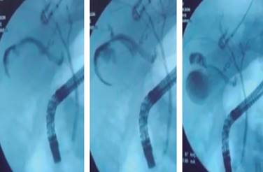 Figura 4: Imágenes de la colangiopancreatografía retrógrada endoscópica, en la que se observa fuga de contraste en pared posterior de la vesícula hacia el parénquima hepático, con probable disección de la pared posterior.