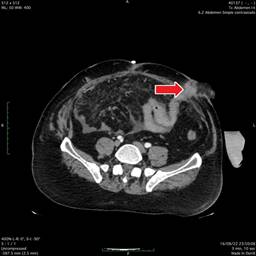 Figura 1: Tomografía computarizada en corte axial en donde se observa la cuarta porción duodenal cercano al ángulo de Treitz y 30 cm restantes con salida a estoma yeyunal. Se encuentra dehiscencia en la aponeurosis de los músculos rectos abdominales.