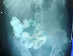 Figura 2: Se realiza pase de medio de contraste por sonda de yeyunostomía, a las 24 horas de la primera reintervención. Muestra paso por yeyuno, íleon y colon.