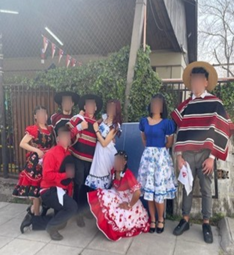 Ligado a la categoría de “comida” encontramos la de “prácticas culturales”. Esta categoría fue ampliamente utilizada, ya que se conformó por imágenes diversas que aludían a festividades, bailes tradicionales, emblemas de la historia nacional e imágenes de la vida cotidiana urbana que los(as) jóvenes consideraron como “prácticas culturales” características de un lugar u otro. Un recurso visual que se utilizó con frecuencia y que se vincula a la categoría “grupo de pares” fue la imagen del grupo de compañeros(as) del contexto escolar o universitario, vestidos para realizar el baile nacional chileno. Al respecto, Dalia (20 años, llegada a los 13 años, nacida en Venezuela, estudiante universitaria) explica (véase Imagen 3).