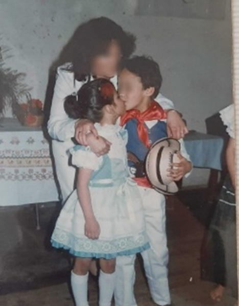 Esta es la foto que representa las cosas como de la cultura en Colombia con las que yo no me siento tan identificada, como que intento romper con ese círculo. Como todas esas cosas a las que a veces uno se siente como obligado familiarmente. Esta es mi abuela y ese es mi papá, esa es una niña que no tengo idea quién es. Desde chicos como que nos fuerzan a hacer cosas porque somos niños y que quizás no queremos hacer (Grupo Fotovoz, #2).