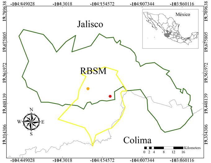 El estudio se realizó en la región centro-sur de la Reserva de la Biosfera Sierra de Manantlán (19° 25' - 19° 45' N, 103° 45' - 104° 30' O) (Figura 1), en el Ejido de Ayotitlán, municipio de Cuautitlán de García Barragán, Jalisco, donde se ubican las comunidades de San Miguel y Telcruz. El estado de Jalisco se ubica en la provincia biogeográfica de la región Neártica, mientras que la RBSM pertenece a la zona de transición fitogeográfica denominada Holártica-Neotropical (Morrone, 2005) en la Sierra Madre Occidental. En la región se han registrado climas cálidos a templados subhúmedos, con temperatura media anual de 16-22°C y precipitaciones de más de 1700 mm (INECOL, 2000).