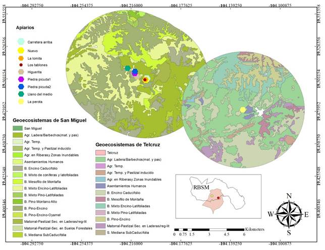 La identificación de la vegetación circundante a las localidades de Telcruz y San Miguel, se realizó con el uso de Sistemas de Información Geográfica (SIG) y el programa ArcMap 10.5. Se obtuvieron los atributos de la vegetación por medio de recortes para el área de influencia (buffer) de 5 km alrededor de los apiarios, en las capas de vegetación de geoecosistemas (unidades de paisaje o unidades ambientales), del Ejido de Ayotitlán para la RBSM. Éstas agruparon información botánica y uso de suelo, datos bioclimáticos y geomorfoedafológicos (Jardel Peláez et al., 2013).