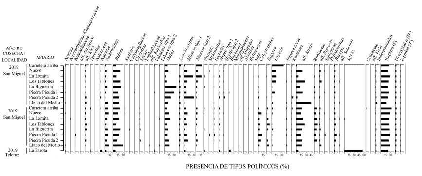 Las muestras obtenidas en la localidad de San Miguel en 2018 se clasificaron de la siguiente manera: una oligofloral de Mimosa, seis biflorales y una estrictamente multifloral. De las muestras de 2019, dos se clasificaron como biflorales, y seis como estrictamente multiflorales. En Telcruz, la miel de la cosecha de 2019 se clasificó como monofloral de Styrax (Cuadro 1).