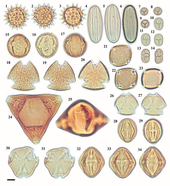 Figura 4 Microfotografías en microscopía de luz de los principales tipos polínicos utilizados para la clasificación de la miel de San Miguel y Telcruz, Ejido de Ayotitlán, Cuautitlán de García Barragán, Jalisco, México. ASTERACEAE: 1-3. Bidens; FABACEAE: 4-6. Dalea, 7-9. Mimosa tipo 1, 10-14. Mimosa tipo 2; FAGACEAE: 15-17. Quercus tipo 1, 18-20. Quercus tipo 2; OLEACEAE: 21-23. Fraxinus; ONAGRACEAE: 24-25. Lopezia; ROSACEAE: 26-29. aff. Rubus; STYRACACEAE: 30-34. Styrax; Escala 10 µm.