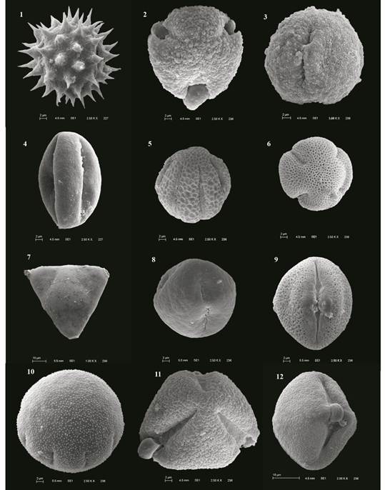 Figura 5 Electronmicrografías en MEB de los tipos polínicos encontrados en la miel de San Miguel y Telcruz, Ejido de Ayotitlán, Cuautitlán de García Barragán, Jalisco, México. ASTERACEAE. 1. Bidens; FAGACEAE. 2-3. Quercus tipo 1, 4. Quercus tipo 2; LAMIACEAE. 5. Tipo Lamiaceae; OLEACEAE. 6. Fraxinus; ONAGRACEAE. 7. Lopezia; ROSACEAE. 8. aff. Rubus; RUBIACEAE. 9. Borreria; SCROPHULARIACEAE. 10. Bacopa. STYRACACEAE. 11-12. Styrax. Tomadas en alto vacío a 10.00 kV.