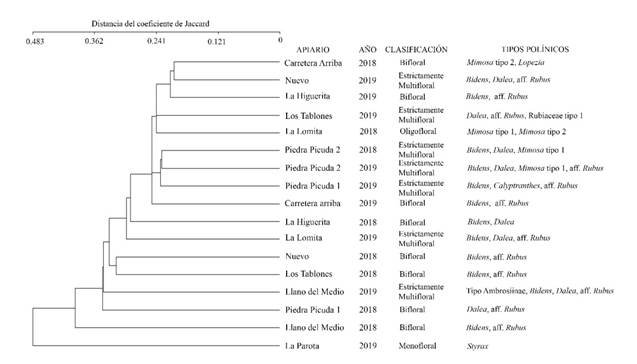Con fines comparativos y para determinar el tamaño del nicho trófico a través del número de taxones presentes en la miel, en cada muestra se estimó la diversidad α a través de los siguientes índices: la riqueza taxonómica (S), el cual indicó el número total del taxones registrados en las mieles; el índice de diversidad α de Shannon-Weaver (H´) que, además del número de taxones, determinó la abundancia de cada uno de ellos; y la equidad de Pielou (J´), que definió la proporción de la diversidad observada con relación a la máxima diversidad esperada (Magurran, 1988; Montes Tubio et al., 2003; Pielou, 1975; Shannon, 1948). Los cálculos se llevaron a cabo con el Software Species Diversity and Richness IV (Seaby & Henderson, 2007). El grado de disimilitud entre los conjuntos polínicos registrados en los apiarios, se evaluó a través de un análisis de agrupamiento jerárquico, utilizando el método de enlace simple y la distancia del coeficiente de Jaccard (Jaccard, 1901); los análisis se realizaron con el software Community Analysis Package 4.0 (Seaby & Henderson, 2007). La distancia de Jaccard indicó la frecuencia con la que las observaciones de cada grupo aparecen juntas; si el valor de la distancia es cercano 1, el grado de disimilitud entre los conjuntos palinológicos es mayor.