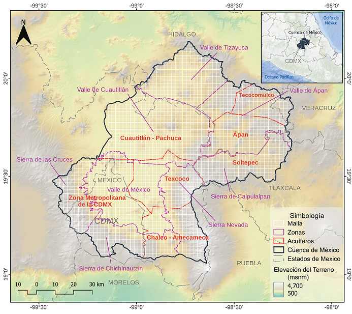 Para su cuantificación y administración, la CM está dividida en siete acuíferos (Figura 1), Chalco-Amecameca en la porción sureste; al oeste el acuífero Zona Metropolitana de la Ciudad de México, al norte los acuíferos Texcoco, CuautitlánPachuca y al noreste los acuíferos Soltepec, Ápan y Tecocomulco. Adicionalmente, para propósitos del análisis estadístico espacial de los datos de recarga potencial de agua subterránea, la CM ha sido dividida en ocho zonas que comparten características topográficas y geológicas (Figura 1): Valle de México, Valle de Cuautitlán, Valle de Tizayuca, Valle de Ápan, Sierra de la Cruces, Sierra de Chichinautzin, Sierra Nevada y Sierra de Calpulalpan.