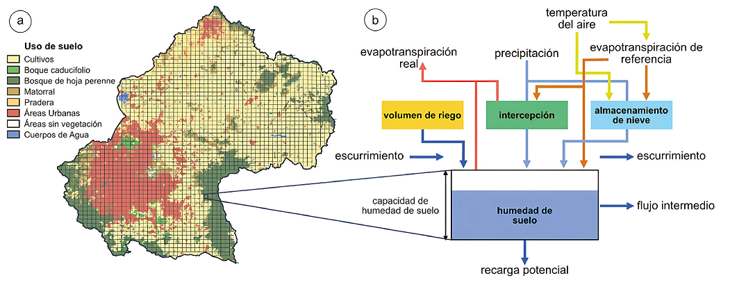 Figura 2 a) discretización espacial y b) estructura del modelo conceptual del USGS Soil Water Balance, basado en la estructura mostrada por Westenbroek et al. (2018).