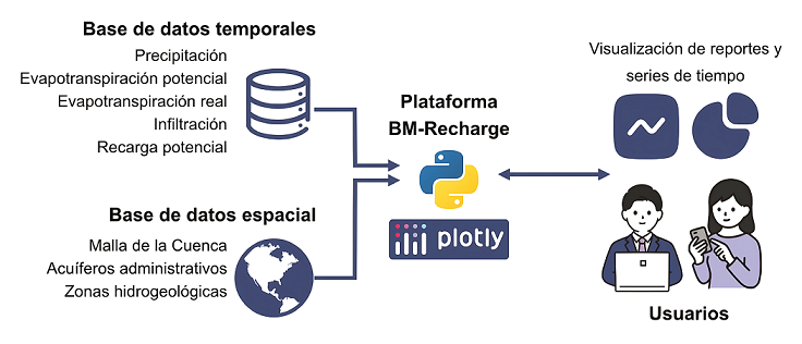 Finalmente, se diseñó la plataforma BM-Recharge para poder visualizar y descargar de manera interactiva y sencilla las bases de datos antes mencionadas, con una estructura general como muestra en la Figura 3. BM-Recharge fue construida con herramientas de código abierto, como son Python en su versión 3.10 (Van Rossum y Drake 2009) y las librerías de Pandas (Hayden et al., 2022) para el análisis de datos tabulares, Plotly y Dash (Hossain, 2019) para la generación de gráficas interactivas y desarrollo de plataformas web. La plataforma utiliza dos bases de datos, una espacial para la consulta de mapas, y otra temporal para la consulta de series, las cuales han sido almacenadas en archivos separados por comas a partir del procesamiento de los archivos NetCDF generados por el modelo SWB. Estas bases de datos son consultadas y procesadas con la librería Pandas para la agregación temporal o para la selección de los elementos seleccionados en el mapa. La librería de Plotly ha sido utilizada para la generación de todas las figuras de la plataforma, mientras que la librería Dash controla la parte interactiva cuando se detectan cambios en la plataforma. BM-Recharge incluye un tutorial extenso para los usuarios y se puede acceder a ella desde el link: bm-recharge.ingenieria.unam.mx.