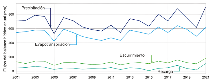 Partiendo del análisis de las series de tiempo, se identificó una tendencia positiva en la precipitación anual en la CM de ~4 mm/año para el periodo del 2001 al 2021, sin embargo, esto no se ve reflejado en la recarga potencial puesto que la evapotranspiración real ha aumentado junto con la precipitación.