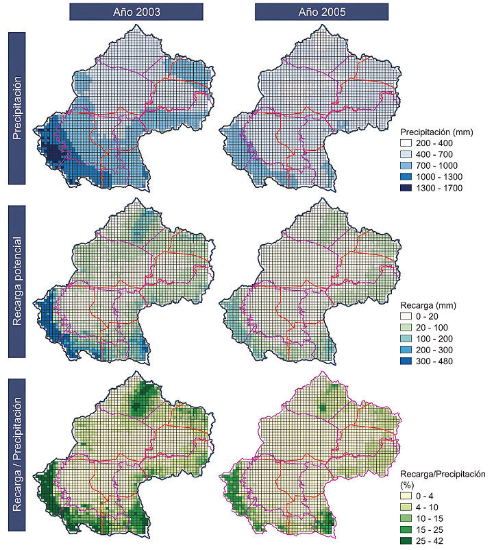 La distribución espacial de la recarga potencial sugiere que en las partes altas de la CM se percibe la mayor precipitación y percolación, con valores estimados por arriba de los 100 mm incluso en años secos como el 2005 (Figura 5). Por otro lado, en los valles la recarga potencial se reduce en un orden de magnitud, llegando a presentar valores estimados por debajo de los 10 mm por año, que representan menos del 4% de la precipitación anual, mientras que en el área urbana la recarga potencial es despreciable.