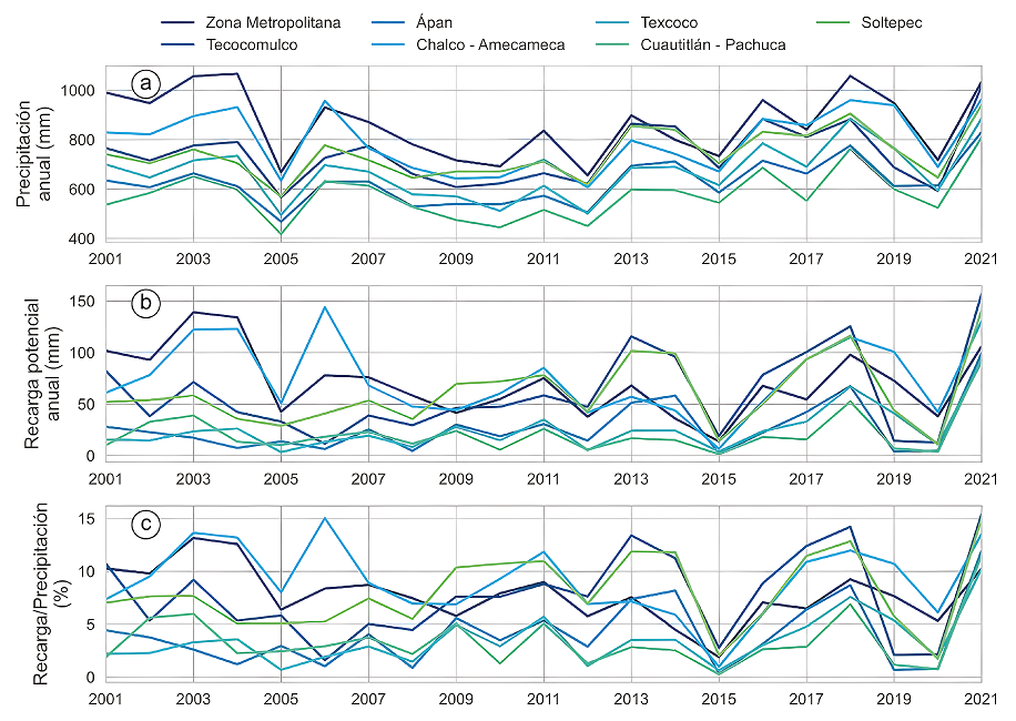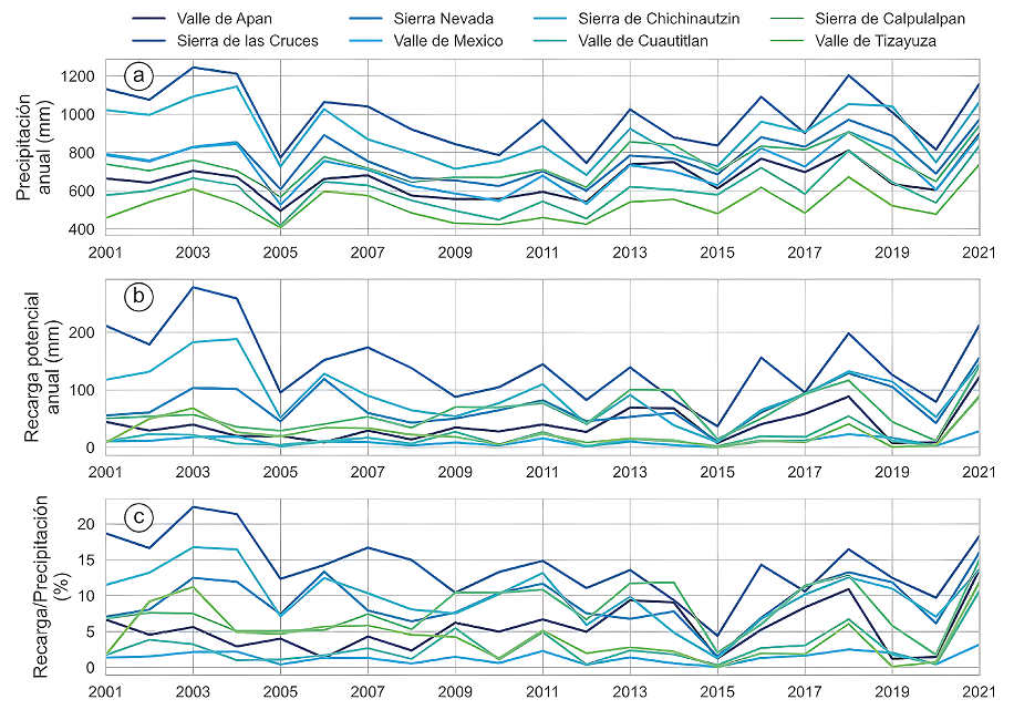 La Sierra Nevada, al sureste de la cuenca, corresponde a otra área de recarga potencial importante que suele ser ignorada debido a la falta registros de estaciones climatológicas. Esta serranía presenta en promedio 100 mm de precipitación anual por debajo de la Sierra de Chichinautzin, pero los valores de la recarga potencial anual son similares en varios años (Figura 6).