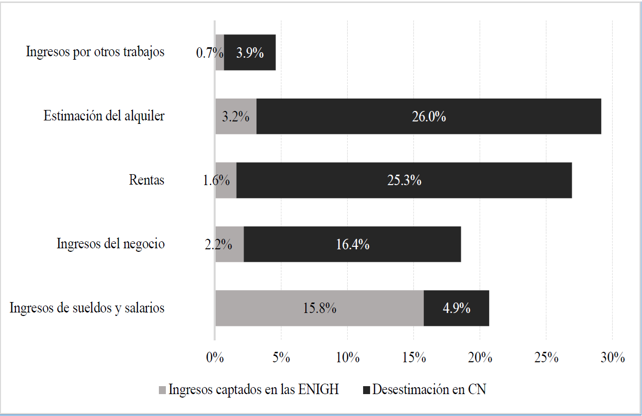 Finalmente, los ingresos por parte del negocio tuvieron un subregistro de 16.4 por ciento y los ingresos por otros trabajos de 3.9 por ciento (Figura 1). En promedio la ENIGH solamente captó 23.5 por ciento de todos los ingresos de las CN.