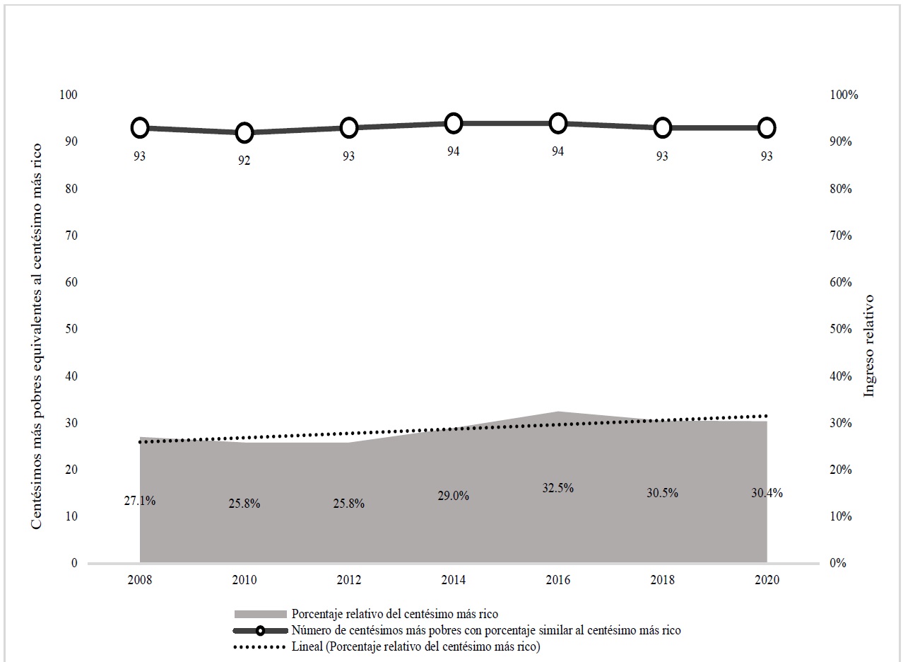Figura 2 Ingreso relativo del centésimo más rico y su comparación porcentual con los centésimos más pobres de México