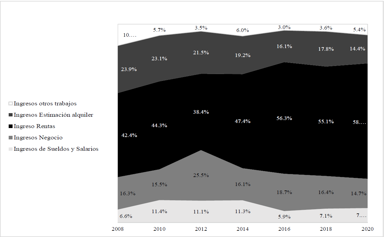 Figura 3 Proporciones de cada tipo de ingreso del centésimo más rico en el periodo 2008-2020