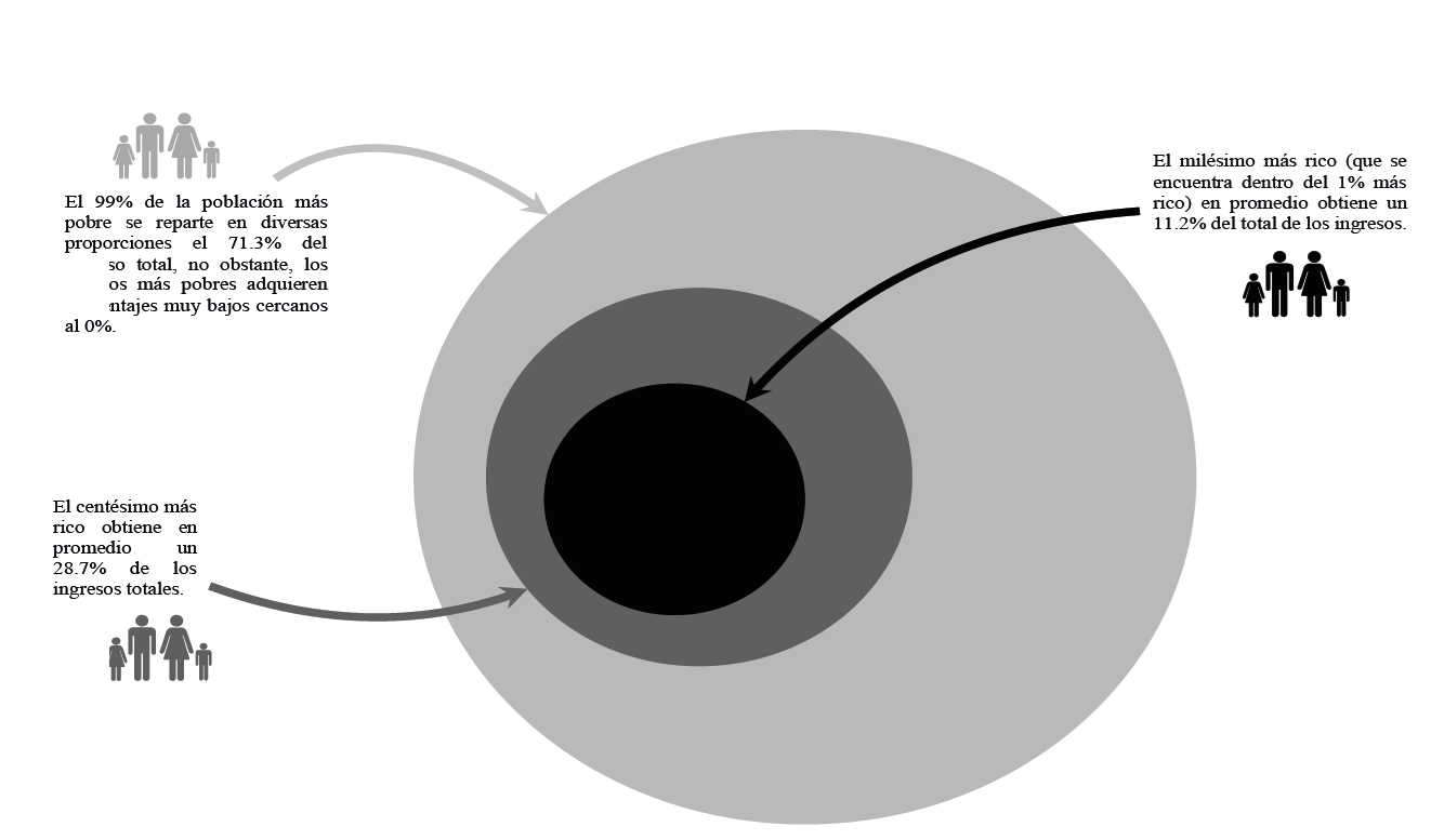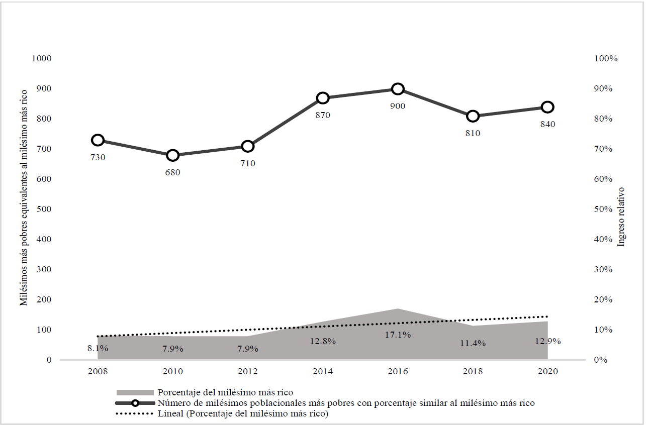 El milésimo más rico tuvo un comportamiento más concentrador, debido a que en el periodo de análisis aumentó 60 por ciento su ingreso inicial en comparación con 12 por ciento que incrementó el centésimo más rico. Con lo anterior referido, se demuestra que la riqueza se ha ido trasladando a un nivel más alto en los últimos años hacia las familias más opulentas mediante un sistema capitalista de concentración basado en rentas donde los mayores dueños del capital o de propiedades han visto un beneficio exponencial que se intensificará en los próximos años si no se crea una regularización y se aplican impuestos progresivos a la renta.