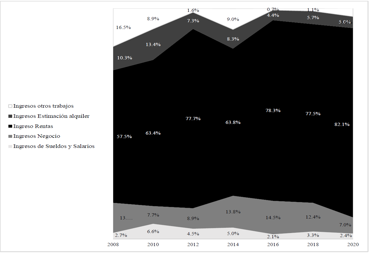 Es importante determinar que, en el centésimo más rico la mayor parte de sus ingresos son de la renta,25 su tendencia es al alta y desde el año de 2016 tiene una proporción mayor a la mitad, al final del estudio elevó su porcentaje a 58.1 por ciento, es decir, está aumentando y volviéndose cada vez más importante en las clases más ricas.
