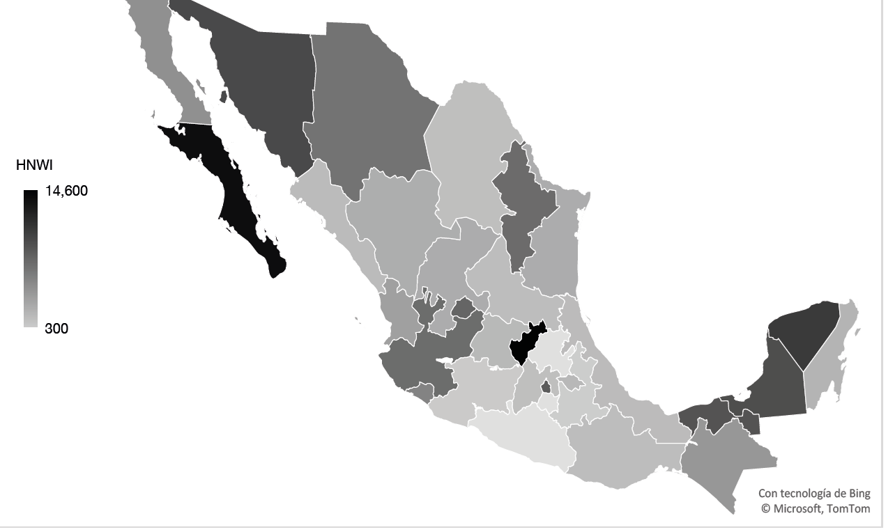 Los Estados que promediaron más de 10 mil HNWI fueron Querétaro, Baja California Sur y Yucatán; en segundo lugar estuvieron los estados de Sonora, Campeche, Tabasco, Ciudad de México, Aguascalientes, Nuevo León, Jalisco, Chihuahua y Colima con un promedio entre 5,001 a 10,000 HNWI; los estados de Baja California Norte, Sinaloa, Durango, Zacatecas, Coahuila, Tamaulipas, San Luis Potosí, Nayarit, Guanajuato, Hidalgo, Estado de México, Morelos, Tlaxcala, Veracruz,41 Oaxaca, Chiapas y Quintana Roo, obtuvieron un promedio entre mil a cinco mil HNWI; las entidades que tuvieron entre cero a mil HNWI fueron Michoacán, Guerrero y Puebla.