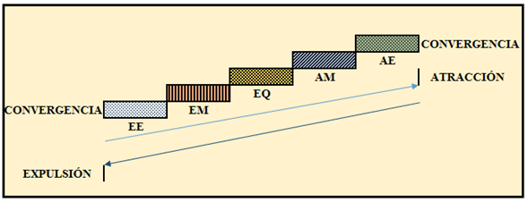 La flecha con pendiente negativa también indica convergencia (Figura 1), aunque no es deseable. Convergente porque cuatro de cinco categorías se estabilizan en un valor, pero una clasificación crece mucho con respecto a los demás (inestabilidad). La clasificación de EE es la ganadora, esto implica que muchos municipios sean netamente expulsores (v.g. los habitantes encuentran mejores oportunidades de trabajo en muchos otros municipios, mejor calidad de vida e incluso mejores condiciones de seguridad pública).