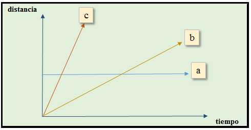 La Figura 2 muestra tres casos de velocidades. Caso a: presenta una velocidad que en el transcurso del tiempo es constante (v.g. pendiente cero), es una velocidad deseable porque al hacer una proyección siempre sabemos su valor. Caso b: la velocidad va en aumento, ya que la pendiente es aproximadamente de 45º, es deseable porque el tiempo que tarda en recorrer una distancia es proporcional, con esto, la velocidad es apreciable. Caso c: la velocidad va en aumento con una pendiente cercana o próxima a los 90º, comparada con b es mayor por la pendiente. La velocidad en el caso c es instantánea por la poca relación que existe entre el tiempo y la distancia (v.g. en poco tiempo que transcurre una gran cantidad de distancia).