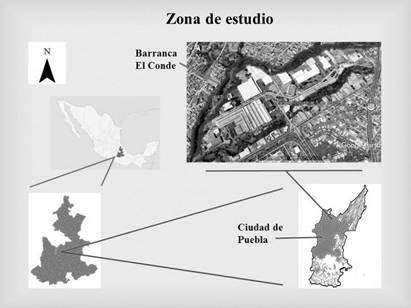 La barranca se ubica al norte de la ciudad de Puebla, al costado izquierdo de la vía corta a Santa Ana Chiautempan con sentido Puebla-Santa Ana Chiautempan, pasando la Central de Abastos (Figura 1). Ya está incorporada en la mancha urbana, presenta casas-habitación en su cauce y recibe descargas de aguas residuales domésticas, e industriales del parque industrial 5 de Mayo.